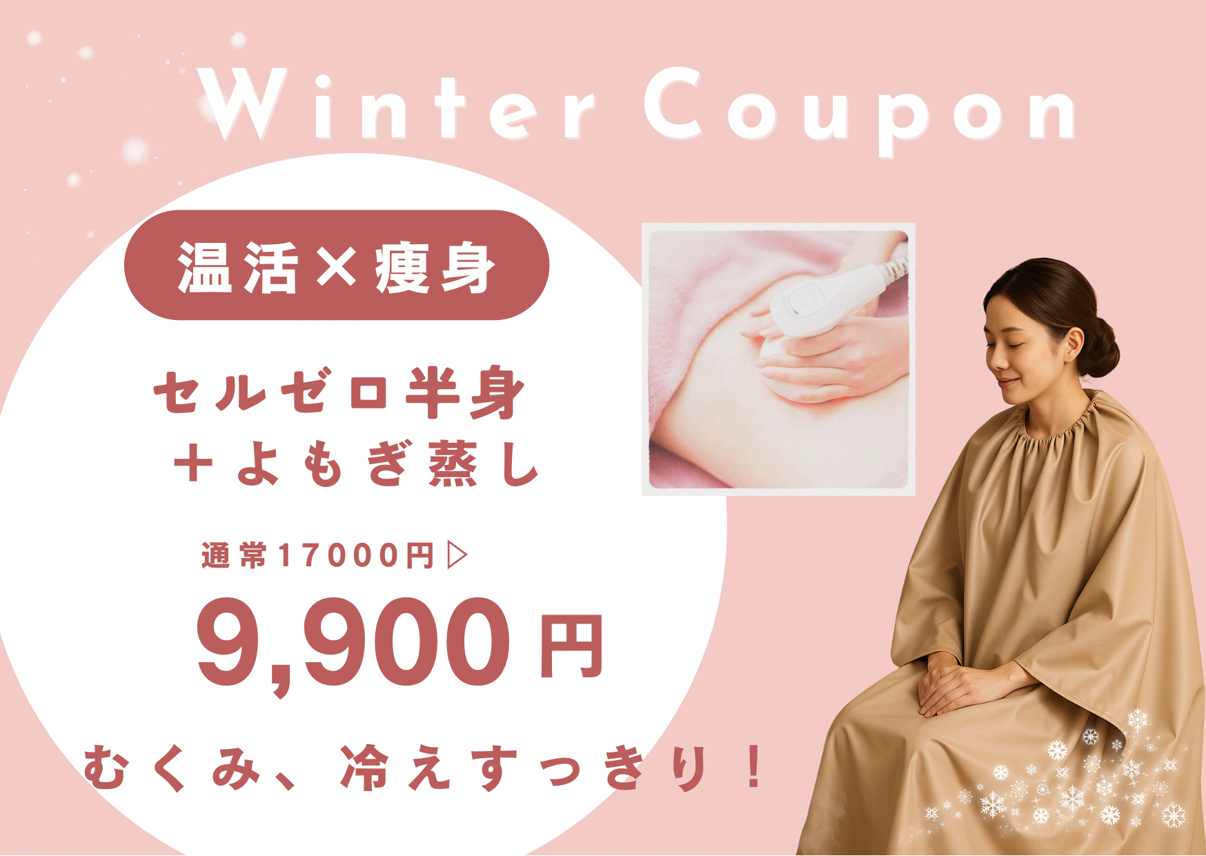 痩身エステ、脱毛、ハーブピーリングなどのキレイになれるメニューがございます。